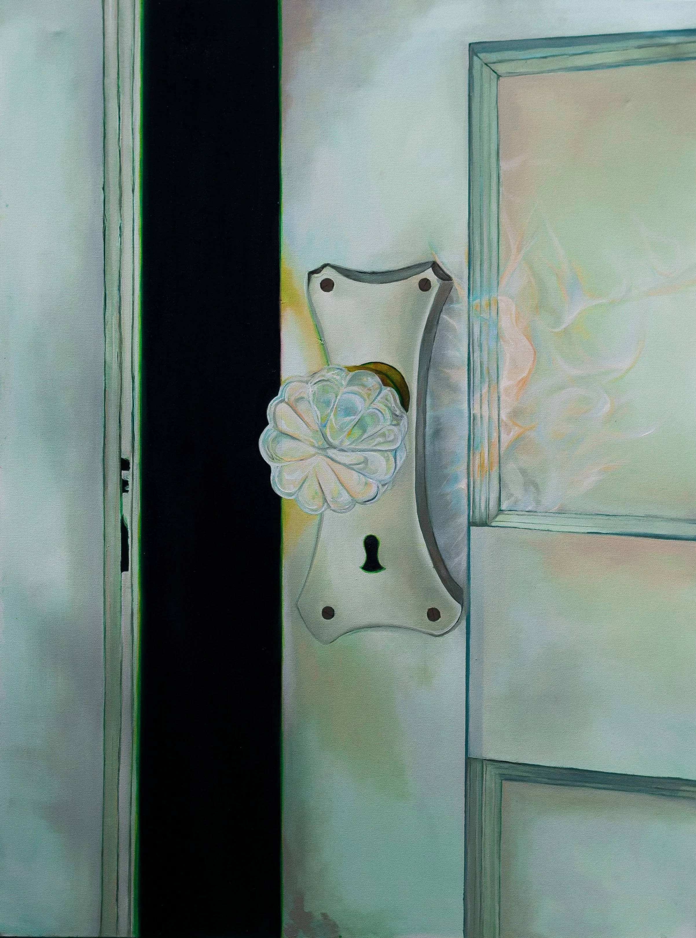 The crystal doorknob motif returns in “Door”, a piece that is anchored by visual symbols of domesticity and a spiritual world. A balance of dancing light and the complete absence of it becomes the major story of this piece. A cleaner, more linear style is utilized for the domestic structure of the door, wall, and doorknob. The scale is quite large and intentionally magnified to the doorknob. Against the deep darkness of the gap between the door and the wall, the doorknob is not just reflecting light, but the only source of it. To Quigley, doors act as a dream-like symbol of a point of entry and exit in a spiritual sense, often leading you into an unknown space away from the familiar.