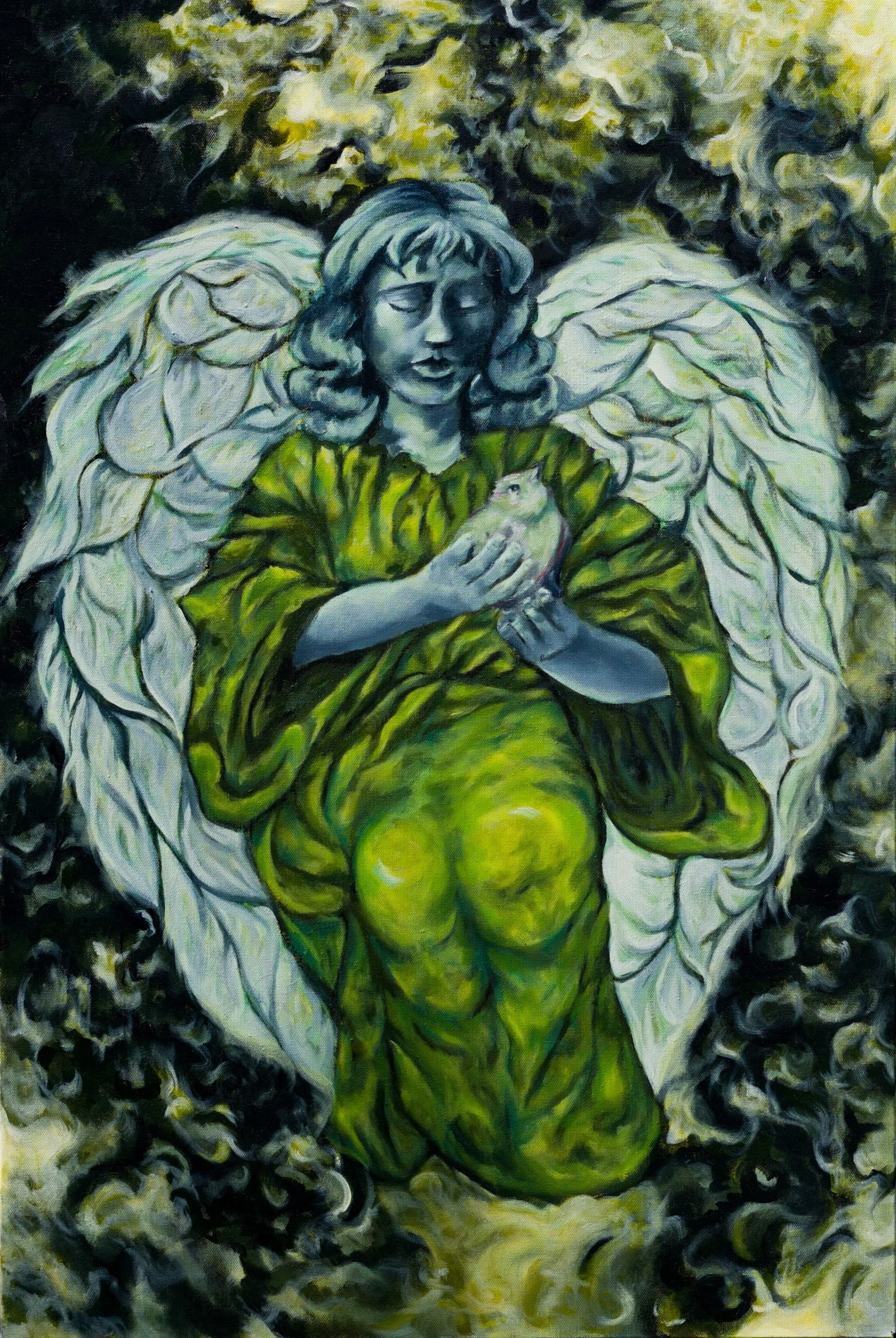 “Angel” was one of the first piece Quigley created while recording her process. While the process included an extensive amount of detailed drawing on the canvas in paint, the saturation comes from a layering of different hues and levels of opacity. The figure has obvious sculptural qualities, such as the grey hues of the face. The figure was inspired by religious statues commonly found in gardens of houses local to Quigley on Long Island.